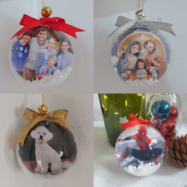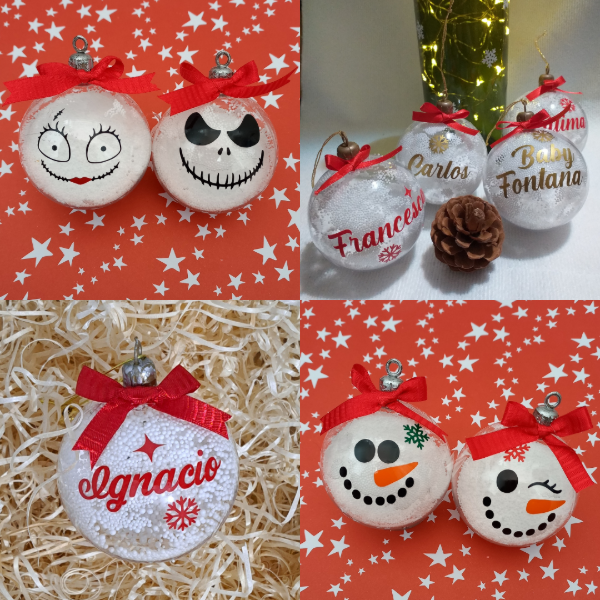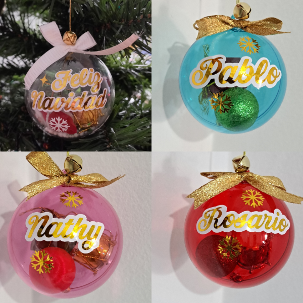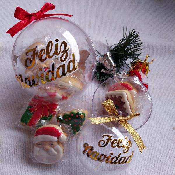 Todas traen decoración adicional como complemento, puedes ver diferentes diseños que hemos hecho en este enlace: Bolitas de Navidad.